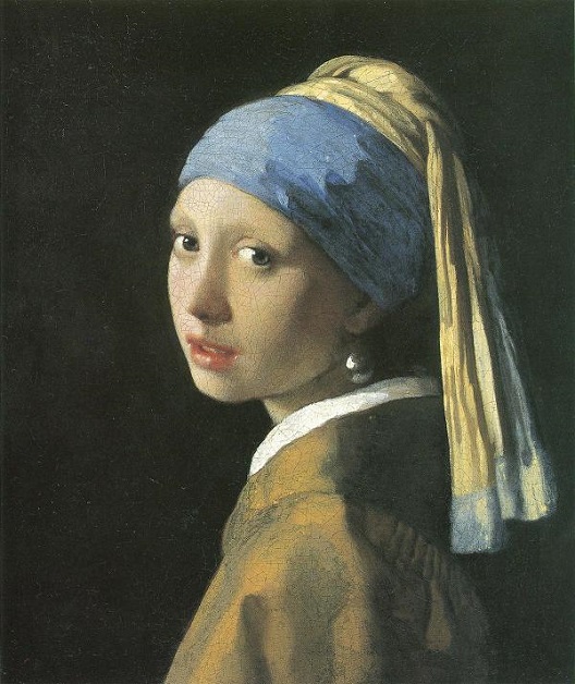 思わず息を呑みこんで、見入ってしまうほどの美しい少女の姿があります。 上半身のみの姿ですが、非常に生々しく、少女の吐息や肌の温かみが伝わってきそうではありませんか。 生きた少女がキャンバスにそのまま閉じ込められたかのようです。 これがフェルメールの最高傑作「真珠の耳飾の少女」です。 この絵画は、別名「青いターバンの女」とも呼ばれ、「西洋のモナリザ」と称されるほどの賞賛を受けました。 毛髪を一筋も見せずに大きなターバンで頭部をしっかりくるみこみ、首までしっかりと衣服を着込んでいるその姿は修道女のようです。 彼女は心持ち体をこちら側に向け、何かを訴えかけるような瞳で少し上目遣いで視線を投げています。 顔立ちは、非常に整っていて明瞭です。 秀でた額、子鹿のようなつぶらな鳶色の瞳、形よい鼻筋、つややかな薔薇色の唇、綺麗な白い前歯、そして透き通るような肌。 どこを見ても完璧です。真っ暗な背景が、少女の美しい顔のフォルムをより強調させています。 頭には大きな青いターバンを巻き、耳にはこれまた大きな真珠の粒のピアスをつけています。 青いターバンは筆舌しがたいほどの美しい色調を放っており、それが少女の肌をさらに美しく見せています。 それもそのはず、その色の原料は鉱石のラピスラズリなのです。 少女は真珠の耳飾以外に装飾品を見につけてはおらず、また黄色い衣服で体を覆って肌をほとんど露出しておりません。 それにも関わらず、どこか艶かしさを感じさせます。 少女は何を想い、こちらを見ているのでしょうか。 実に意味ありげな、ミステリアスな表情をしています。 一度この絵を見たら、永遠に忘れることはできないでしょう。 それほどインパクトのある人物画像なのです。